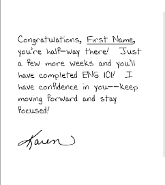 Sending out these cards cost me about $5 per student, but I think the results were worth it. In the semester that I sent out the cards, I only lost one student. (Those of you who teach online know how rare that is–especially in an accelerated course!) My results at this point are only anecdotal, but I’m hoping to do more research into using cards in the future.