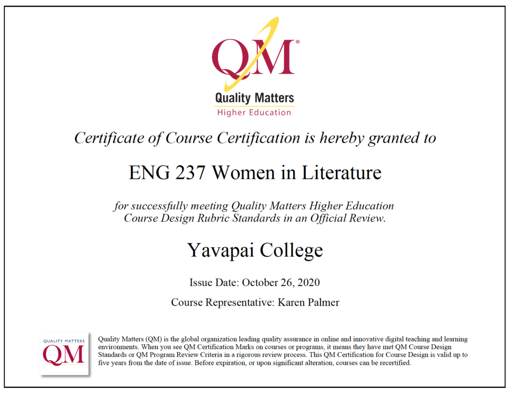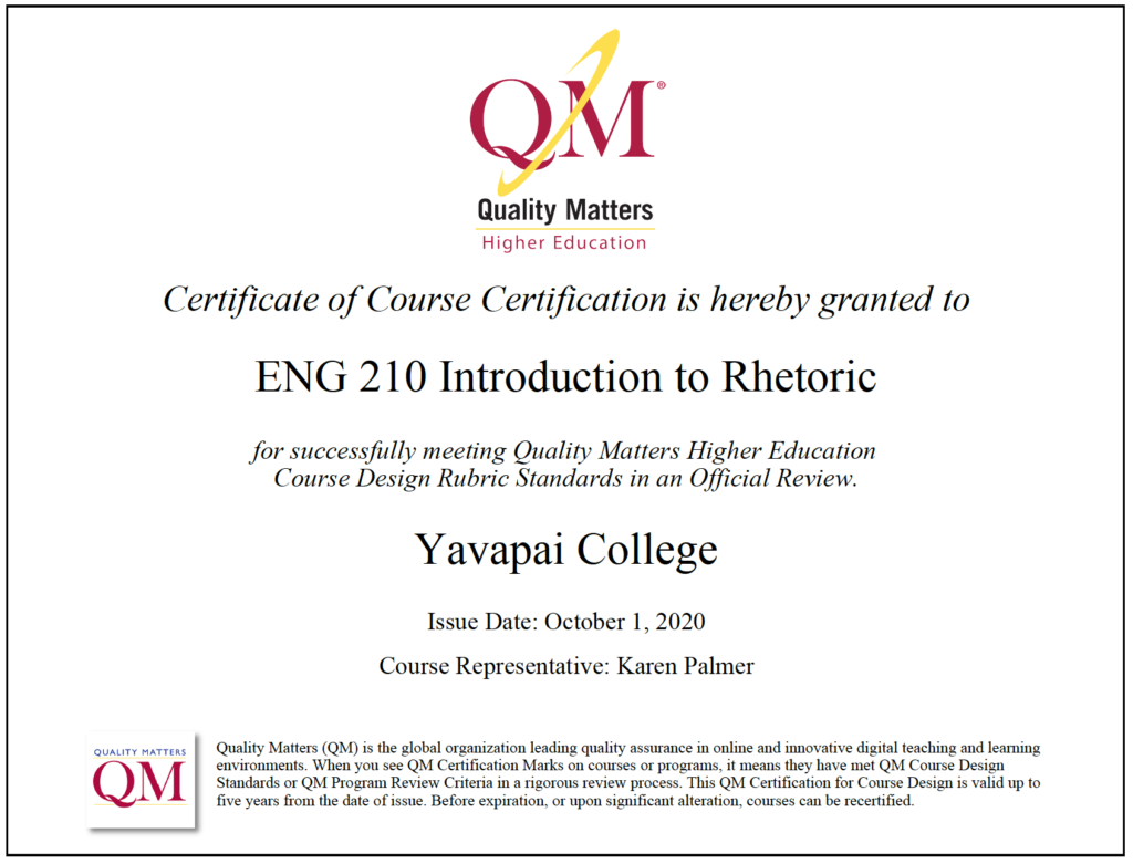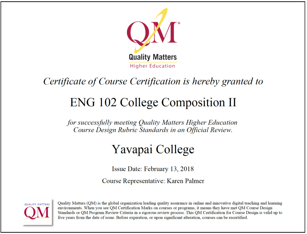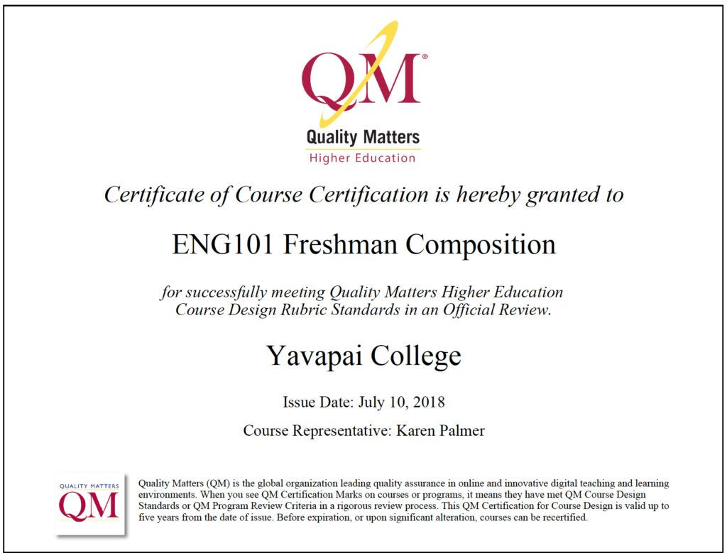 When I began teaching full-time at YC as a one semester temporary faculty member, I was introduced to QM again through Lindsay Henning’s IYOC workshops. Already convinced of the importance of good design for online courses, I determined to obtain QM certification for both ENG 101 and ENG 102, which I accomplished by the end of that school year.