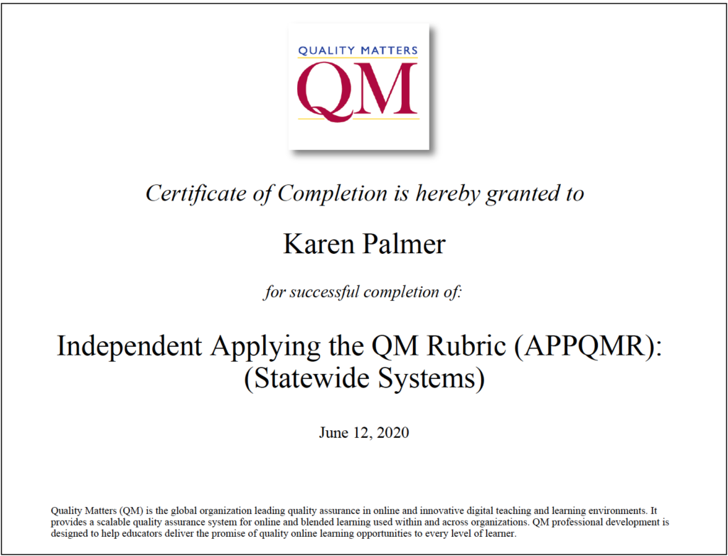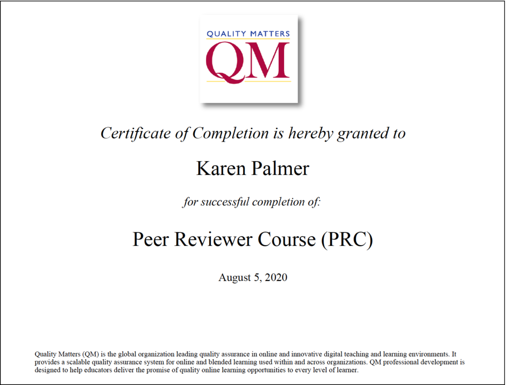 I have completed the IYOC course a total of three times. In addition, I completed the APPQMR and the PRC courses in the summer of 2020. I am now certified as a QM Peer Reviewer.