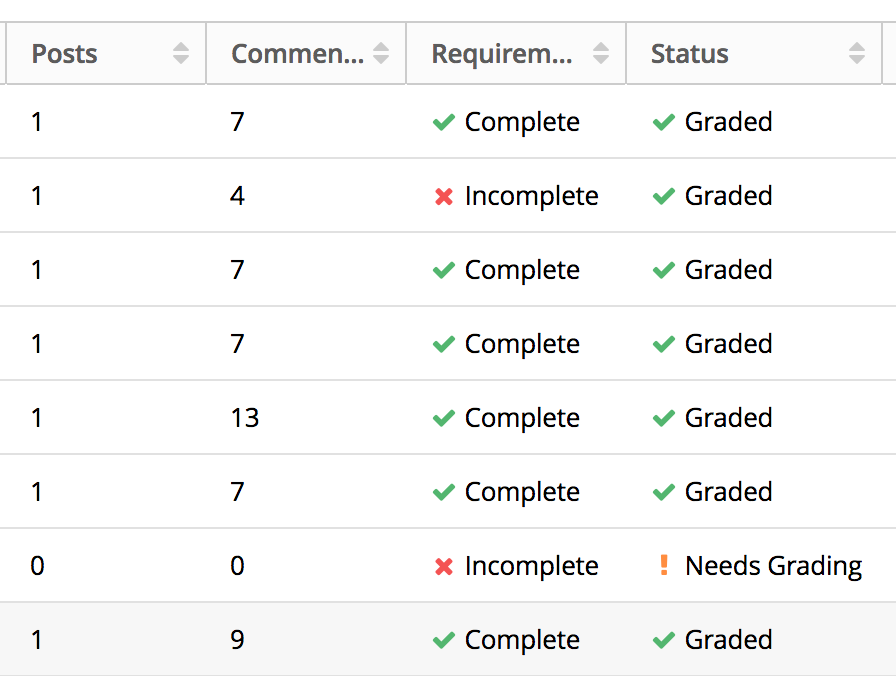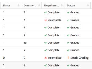 Notebowl discussions do offer some pretty great capabilities, though, like the option to set a required word count and requirements for a student’s initial post and subsequent replies. For example, I can set a discussion to require a 250 word count initial post and two additional comments. Notebowl will show me whether students have completed the requirements or not, making grading much easier. There is even an option to autofill grades based on whether criteria have been met.  The following is a screenshot of the gradebook for Notebowl. This is also what shows up in Speed Grader, as well; student submissions aren’t separated out.